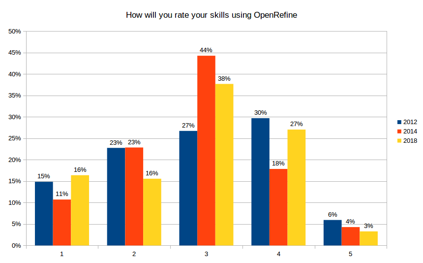 Both in 2012 and 2014 we asked respondents to rate their skills from one to five. One being a novice in Refine and five being a master. This graph confirms the trends that the community is composed of advanced users with the only a third of them rating their skills at 1 or 2 out of 5.