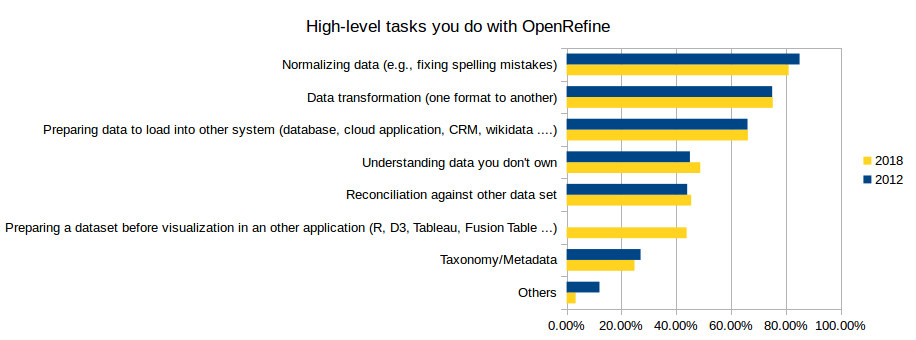 The majority of the respondents use OpenRefine to normalize data (80%) and transform it (75%). We introduced the answer Preparing a dataset before visualization in another application (R, D3, Tableau, Fusion Table ...) in the 2018 survey.